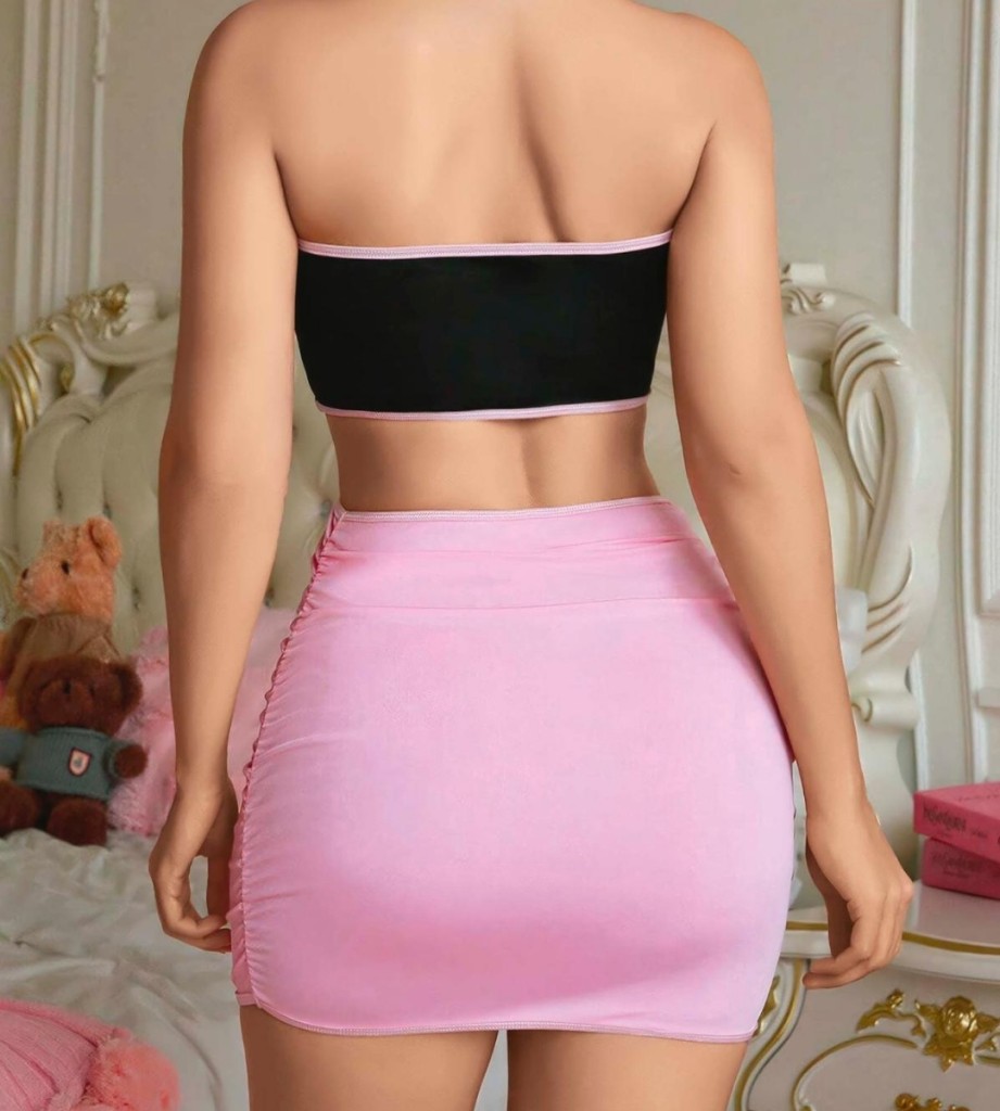 Feminen detaylarla cesur bir görünüm sunan bu siyah fantezi mini gecelik takımı, pembe kurdele süslemeleriyle romantik bir hava taşır. Straplez üst kısmı vücudu sararken, mini etek formundaki alt kısmı hareketli ve şık bir duruş kazandırır. Hafif, esnek kumaşıyla konforlu kullanım sağlarken, özel gecelerde sizi farklı kılacak göz alıcı bir tercihtir.